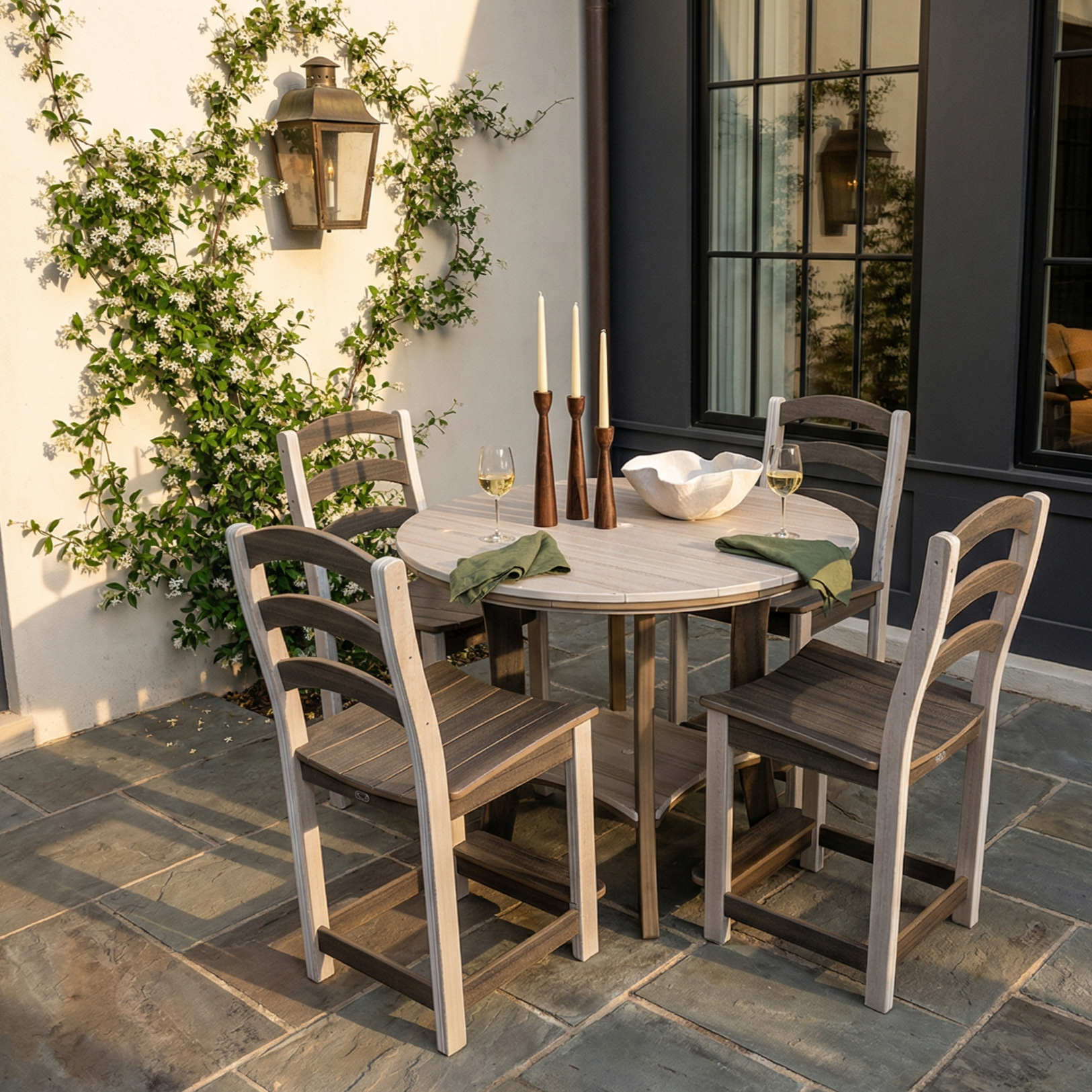 Unlike wood, metal, or wicker furniture, poly lumber won’t splinter, crack, or rot when exposed to moisture. It also resists fading in the sun and doesn’t absorb water, which helps prevent warping over time. Paired with marine-grade hardware that resists rust, poly furniture stands up to rain, humidity, and changing seasons with very little maintenance.